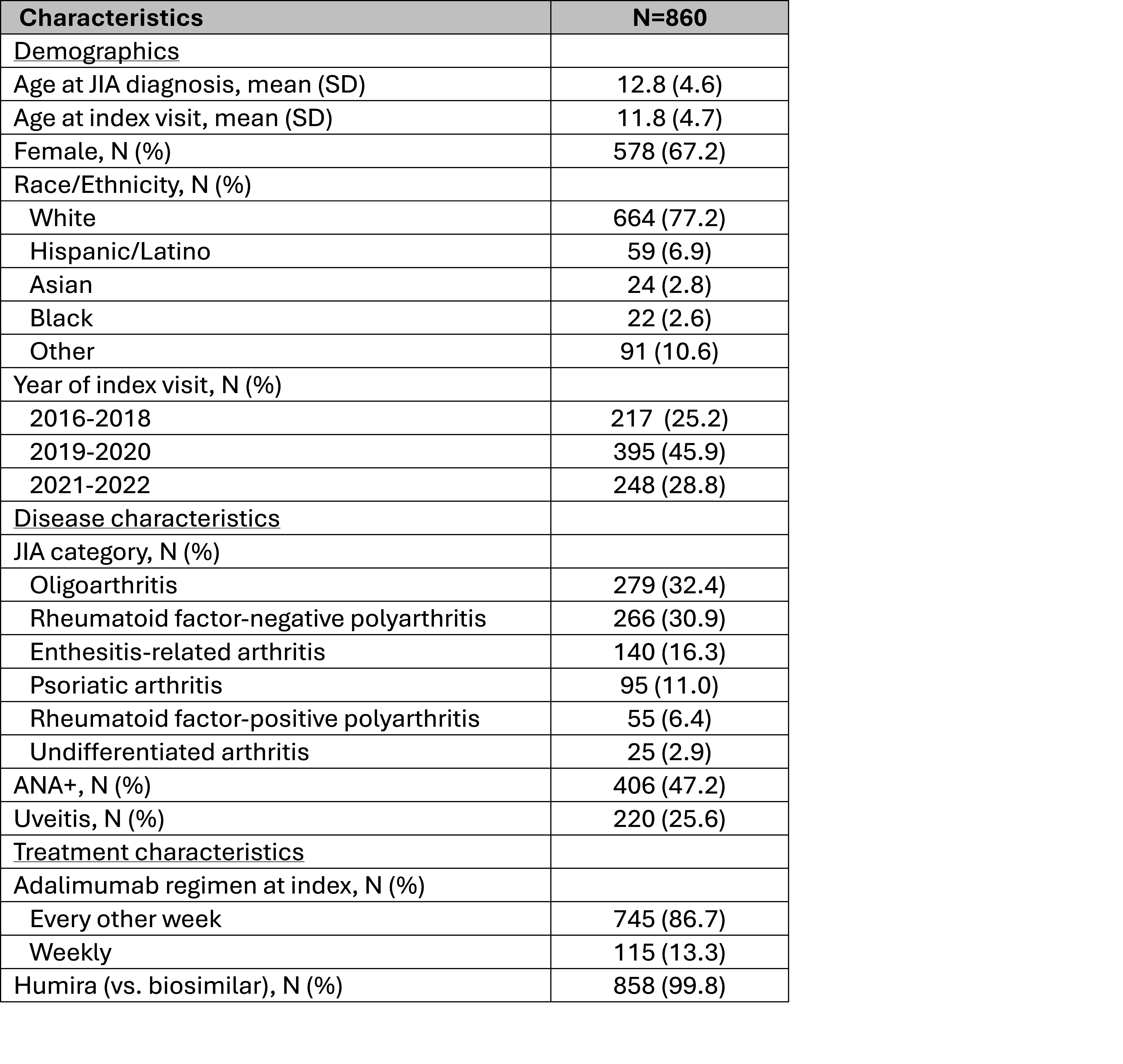 Table 1: Baseline characteristics of children with well-controlled JIA on adalimumab in the CARRA Registry.Supporting image 1ANA, antinuclear antibody; bDMARD, biologic disease-modifying anti-rheumatic drug; cDMARD, conventional disease-modifying anti-rheumatic drug; SD, standard deviation