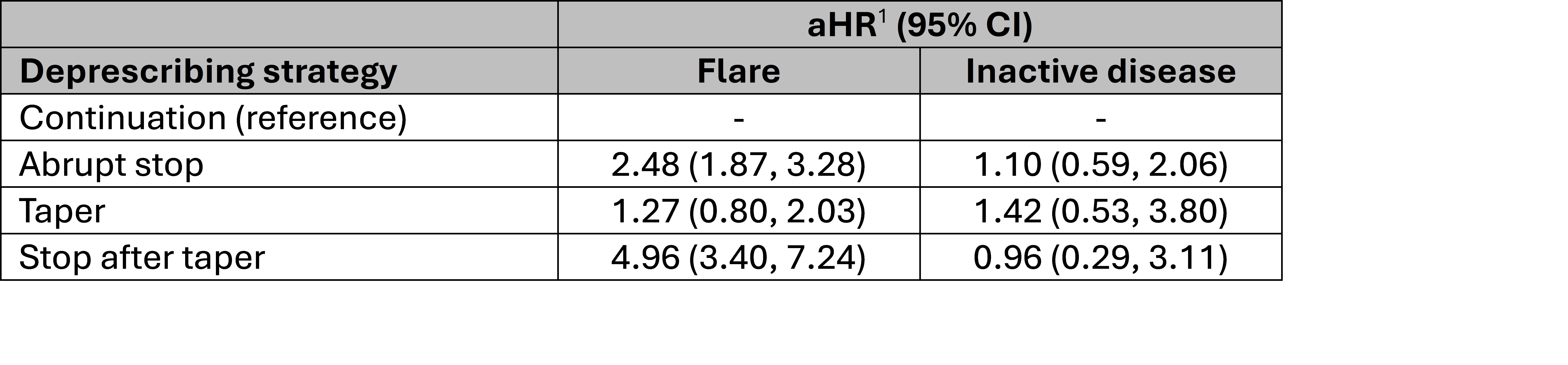 Methods: We conducted a retrospective cohort study using data from the CARRA Registry (2016-2022). Eligible participants were taking adalimumab and had inactive non-systemic JIA (joint count=0, physician global assessment (PhGA)≤1, stable DMARD dose, no glucocorticoids) for 2 visits ≥5 months apart. Two deprescribing strategies (abrupt stop or tapering) were compared with adalimumab continuation. Participants were followed across multiple treatment strategies (e.g., continuing, tapering, stopping). Outcome #1 was flare (defined by higher adalimumab dose/frequency, restarted adalimumab after stopping, new DMARD or glucocorticoid, joint count ≥1, PhGA >1, or new uveitis activity). Among those who flared, outcome #2 was recapture of inactive disease. Causal associations between treatment strategy and outcomes were estimated using marginal structural modeling with weighted Cox proportional hazards regression and time-varying treatment. Stabilized inverse probability of treatment weights (IPTWs) were constructed from treatment models stratified by prior treatment state, adjusted for clinical, disease-related, and treatment covariates (including concomitant methotrexate use) and expressed as adjusted hazard ratios (aHRs) with 95% confidence intervals (CIs). Missing covariates were handled using multiple imputation by chained equations.