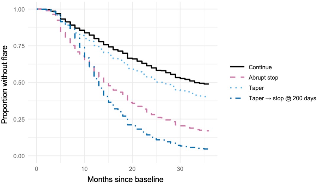 Figure. Model-adjusted survival without flare based on hypothetical treatment strategies.Supporting image 3Model-adjusted Kaplan-Meier curves for survival without flare for hypothetical treatment strategies (continue, abrupt stop, taper, taper and then stop after 200 days, the median duration of observed tapers), estimated using marginal structural modeling with weighted Cox proportional hazards regression and time-varying treatment, adjusted for age, sex, race, ethnicity, standardized height and weight, JIA type, joint involvement (oligo vs. poly), ANA status, history of uveitis Childhood Health Assessment Questionnaire (CHAQ), patient/caregiver global score, and concomitant conventional disease-modifying anti-rheumatic drug (DMARD) use.