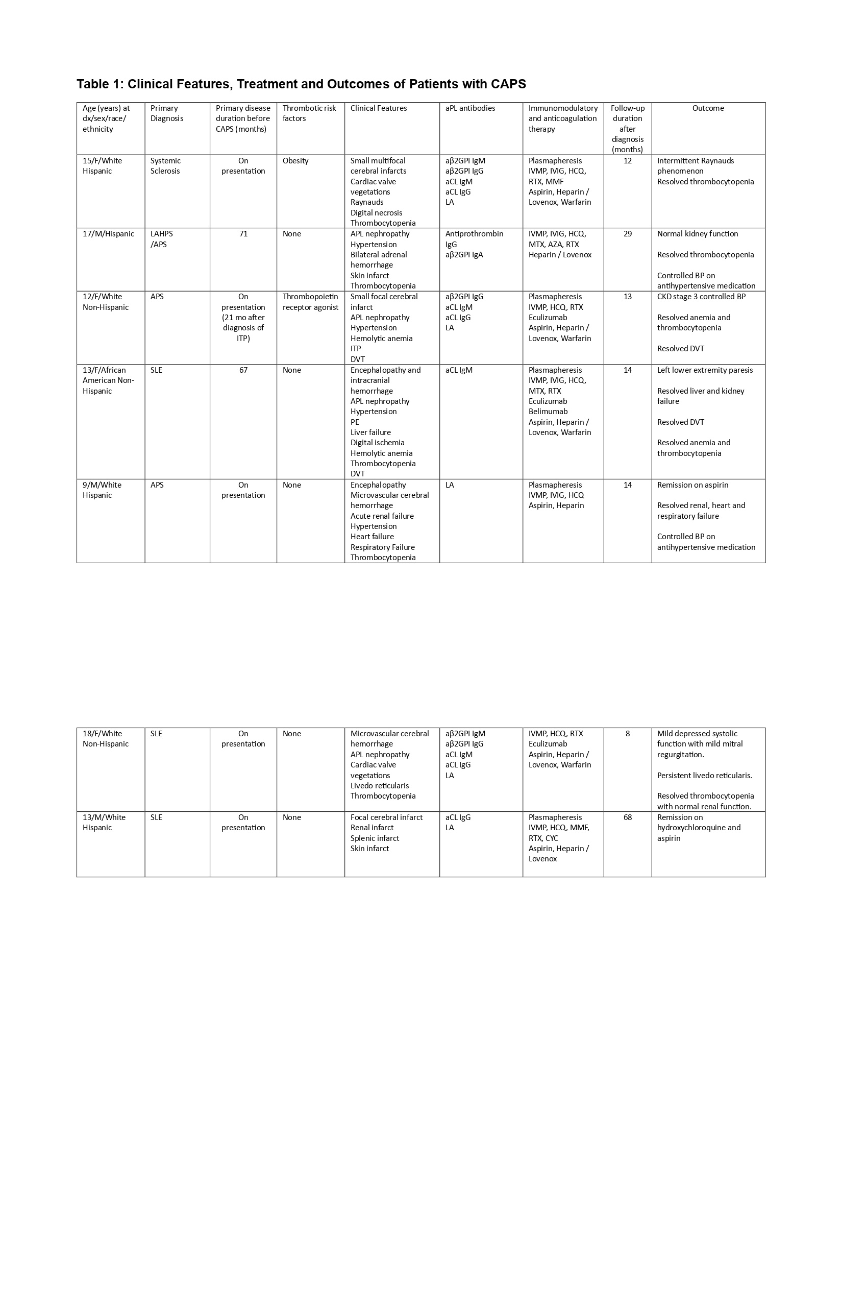 Results: We report 9 LAHPS patients (median age 11 years, 78% female, all SLE) and 7 CAPS patients (median age 13.1 years, 57% female, 43% SLE). LAHPS patients uniformly presented with hemorrhagic manifestations, including pulmonary/intracranial hemorrhage 22%, and cytopenias, including thrombocytopenia (66%) and immune hemolytic anemia (88%). Common clinical manifestations in CAPS patients included microvascular involvement of renal and neurologic systems (86%), and endocarditis (29%).