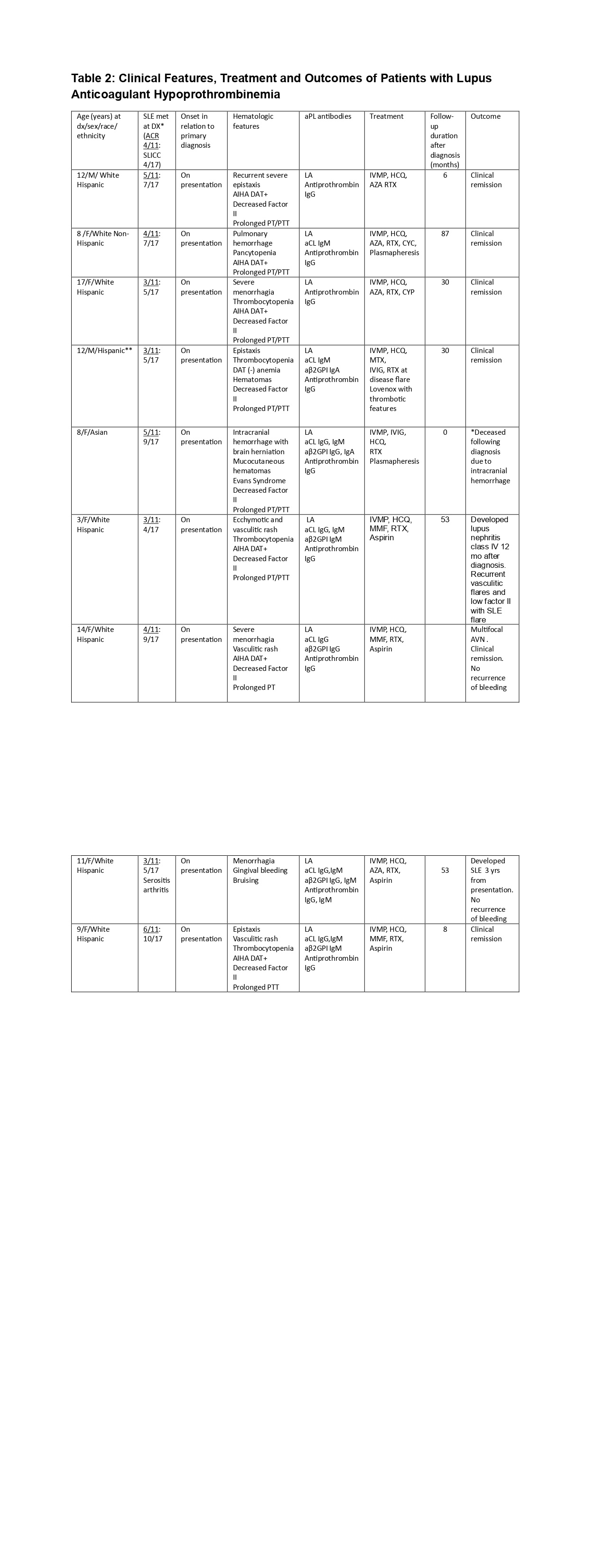***LAHPS lupus anticoagulant hypoprothrombinemia, AIHA autoimmune hemolytic anemia, DAT Direct antiglobulin test, LA lupus anticoagulant, aCL anticardiolipin; aβ2GPI anti–β2-glycoprotein I, IVMP intravenous methylprednisolone, IVIG intravenous immunoglobulin, AZA azathioprine, HCQ hydroxychloroquine, MTX methotrexate, MMF mycophenolate mofetil, RTX rituximab, CYC cyclophosphamide, AVN avascular necrosis