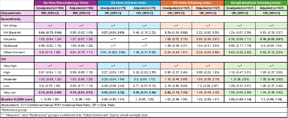 Results: A total of 170 patients met eligibility criteria. Within this population 53.5% had Medicaid, and 37.5% lived in low or very low COI tracts (15.5% and 22.0%, respectively) (Table 1). We observed a racial disparity in on time rheumatology visits (IRR for Black/AA vs. White: 0.84, CI 0.75-0.94), infusion visits (OR for Black/AA vs. White: 0.27, CI 0.08-0.83), and number of ED visits following the index encounter (OR for Black/AA vs White: 2.74, CI 1.31-5.92). After adjusting for COI and baseline disease severity, the racial disparity was not present for any of the aforementioned outcomes (Table 2). A statistical significance between Hispanics vs White for hospitalizations after index was observed. After adjusting for the follow up duration, the racial disparity was no longer present.