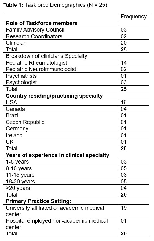 Ekemini Ogbu1, Martha Rodriguez2, Alexandra Theisen3, Simone Appenzeller4, Emily Beil5, Onengiya Harry6, Ryan Kammeyer7, Natoshia Cunningham8, Kristen Fisher9, Marisa Klein-Gitelman10, Monica Banks11, Eyal Muscal12, Sefi Kronenberg13, Paige Seegan14, Lawrence Ng15, Marietta DeGuzman12, Mckenna Bowes16, Kiana Johnson17, Y. Ingrid Goh18, Eve Smith19, Katerina Bouchalova20, Lea Höfel21, Jainish Patel1, Mekibib Altaye22, Rashmi Sahay23, Susanne Benseler24, Hermine Brunner1 and Andrea Knight25, 1Cincinnati Children's Hospital Medical Center, Cincinnati, OH, 2Riley Hospital For Children At Indiana University, Carmel, IN, 3Riley Hospital for Children at Indiana University, 4Universidade Estadual de Campinas, Brazil, 5Atrium Health, Levine Children's Hospital, 6Atrium Health Wake Forest School of Medicine, 7Departments of Pediatrics and Neurology, University of Colorado School of Medicine, Aurora, CO, 8Michigan State University, Grand Rapids, 9Baylor College of Medicine, 10Ann & Robert H. Lurie Children's Hospital Chicago, Chicago, IL, 11Family Advisory Council, Neuropsychiatric Workgroup, Childhood Arthritis and Rheumatology Research Alliance, 12Baylor College of Medicine, houston, TX, 13The Hospital for Sick Children and University of Toronto, 14Johns Hopkins School of Medicine, Baltimore, MD, 15The Hospital for Sick Children, Toronto, Canada, Toronto, ON, Canada, 16West Virginia University School of Medicine, Morgantown, WV, 17East Tennessee State Universityy, TN, 18The Hospital for Sick Children, 19University of Glasgow, Glasgow, Scotland, United Kingdom, 20Palacky University Olomouc, Olomouc, Czech Republic, 21Pediatric clinic Garmisch-Partenkirchen / Germany, Garmisch-Partenkirchen, Bayern, Germany, 22Cincinnati Children's Hospital, Cincinnati, 23Cincinnati Children's Hospital Medical Center, OH, 24Children’s health Ireland, Dublin, Dublin, Ireland, 25Hospital for Sick Children, Toronto, ON, Canada