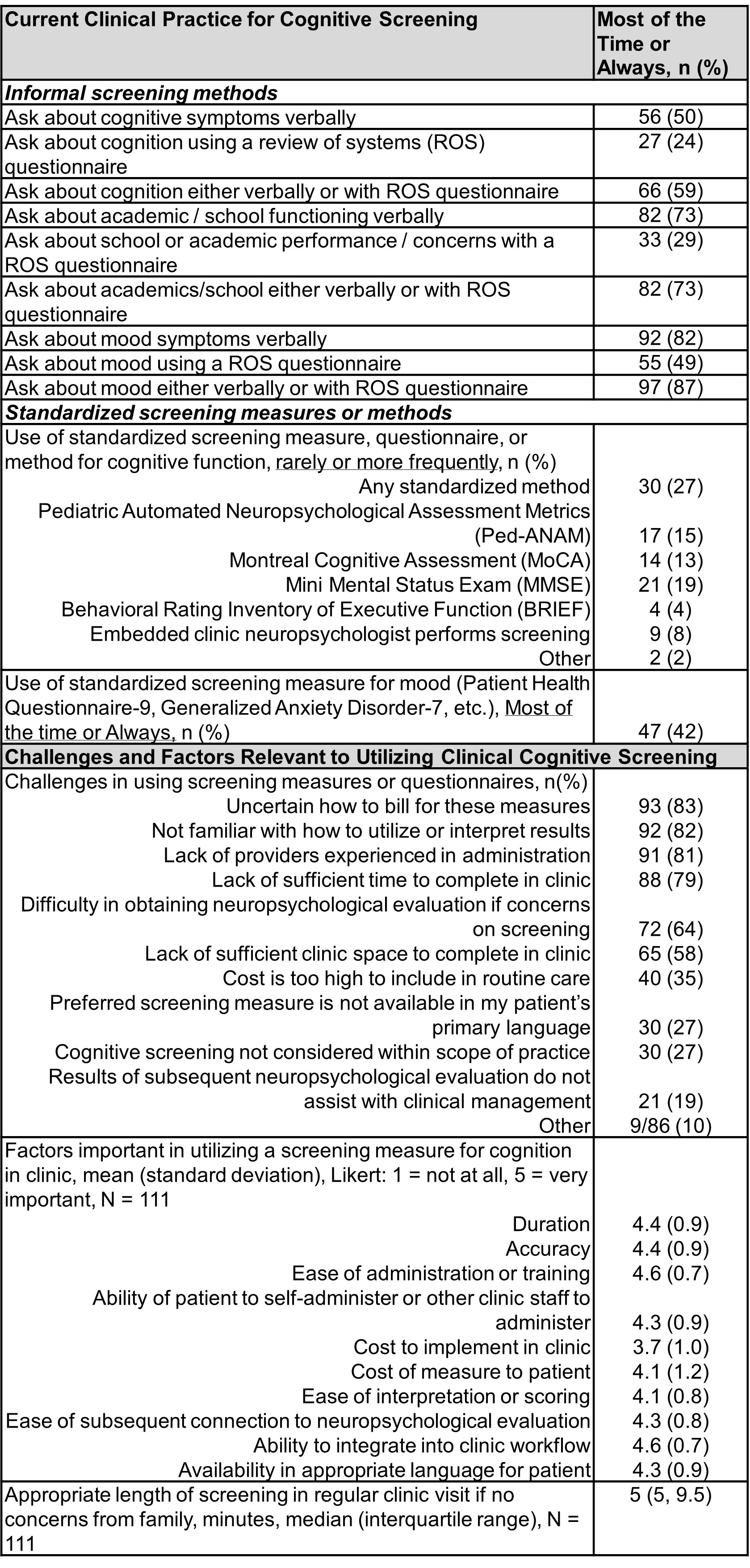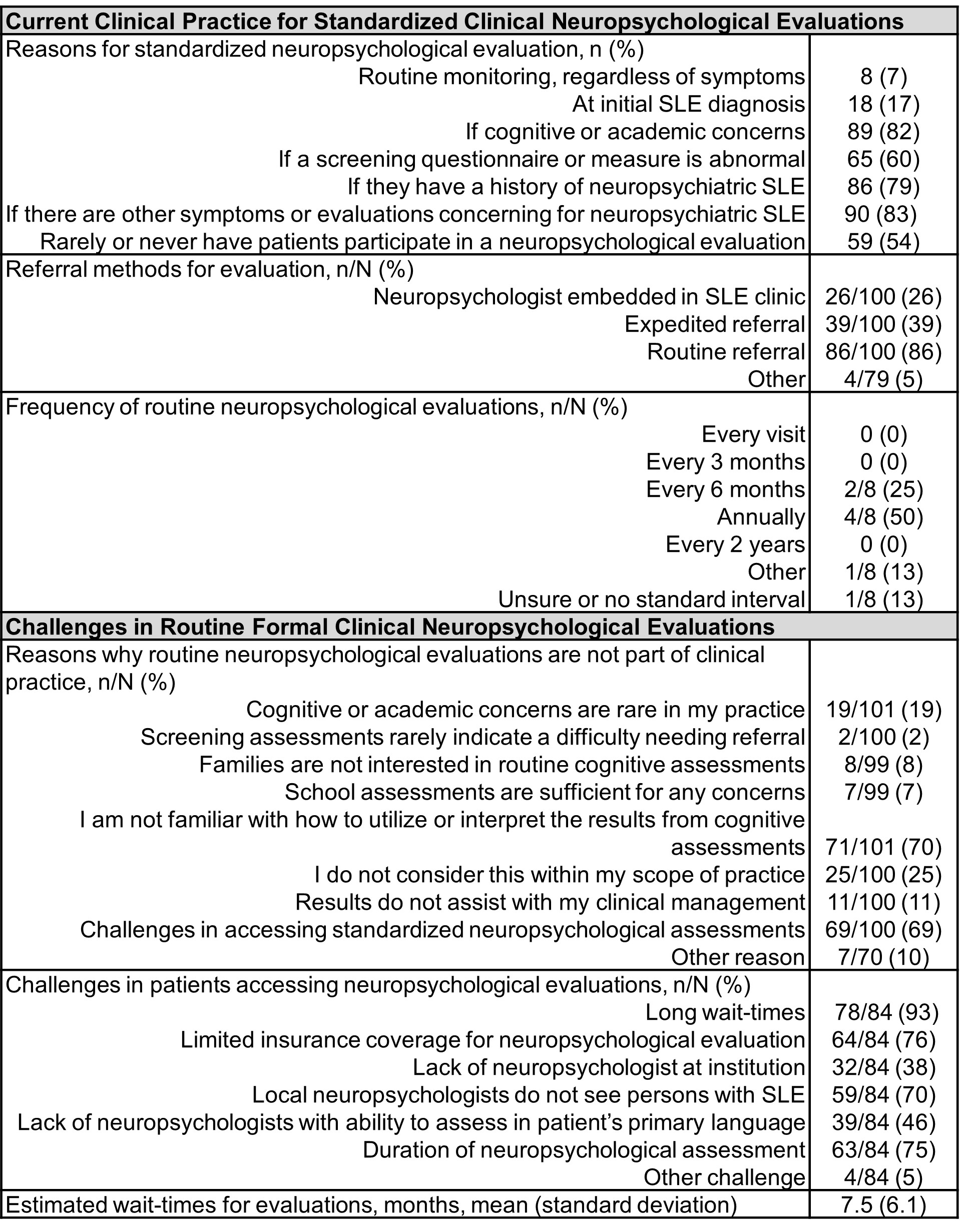 Conclusion: Currently, standardized screening methods and neuropsychological evaluation are infrequently used for evaluation of CD in cSLE. While rheumatologists understand that cognitive screening and neuropsychological evaluation are important components of care for youth with cSLE, they face multiple barriers related to guidance on optimal screening frequency/approaches, limited training, time and access to appropriate services. Future work addressing these challenges will support these providers and improve care for patients with cSLE.