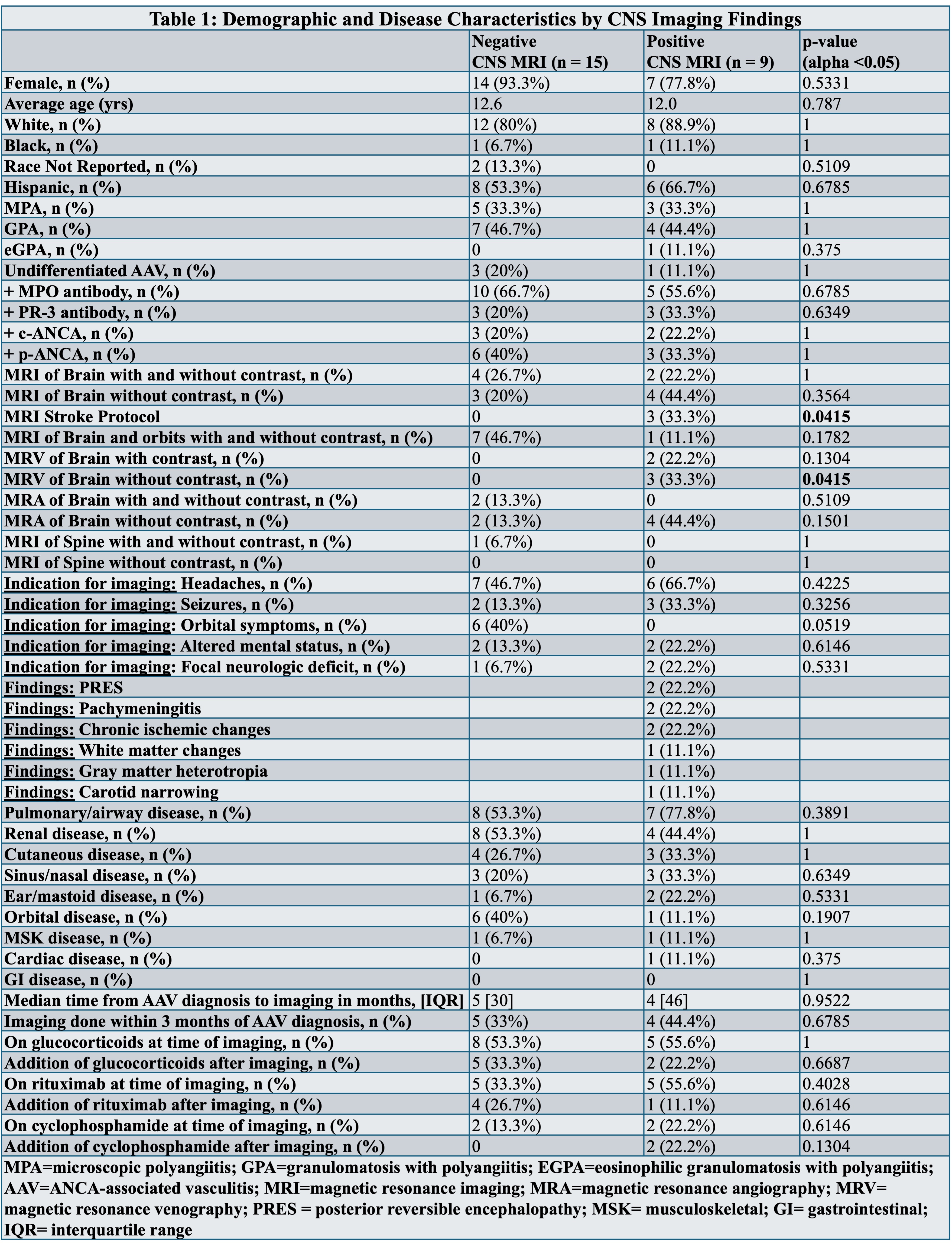 Methods: With Institutional Review Board approval, we conducted a retrospective review of pediatric AAV cases at our quaternary children’s hospital. Using SlicerDicer, we identified patients ≤18 years with granulomatosis with polyangiitis (GPA), microscopic polyangiitis (MPA), or eosinophilic GPA (EGPA) from January 2015 to August 2025. We screened for brain or spine MRI studies (standard MRI, stroke protocol, magnetic resonance angiography (MRA), or magnetic resonance venography (MRV)). Clinical and demographic data were collected, and all MRIs were interpreted by a neuroradiologist. Categorical and continuous variables were analyzed using Fisher’s Exact and Wilcoxon Rank-Sum tests.