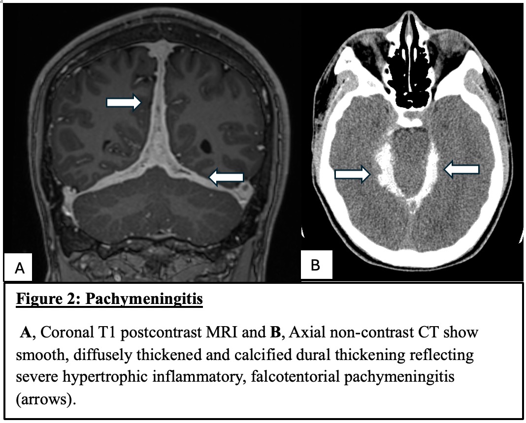 A, Coronal T1 post-contrast MRI and B, Axial non-contrast CT show smooth, diffusely thickened and calcified dural thickening reflecting severe hypertrophic inflammatory, falcotentorial pachymeningitis (arrows).