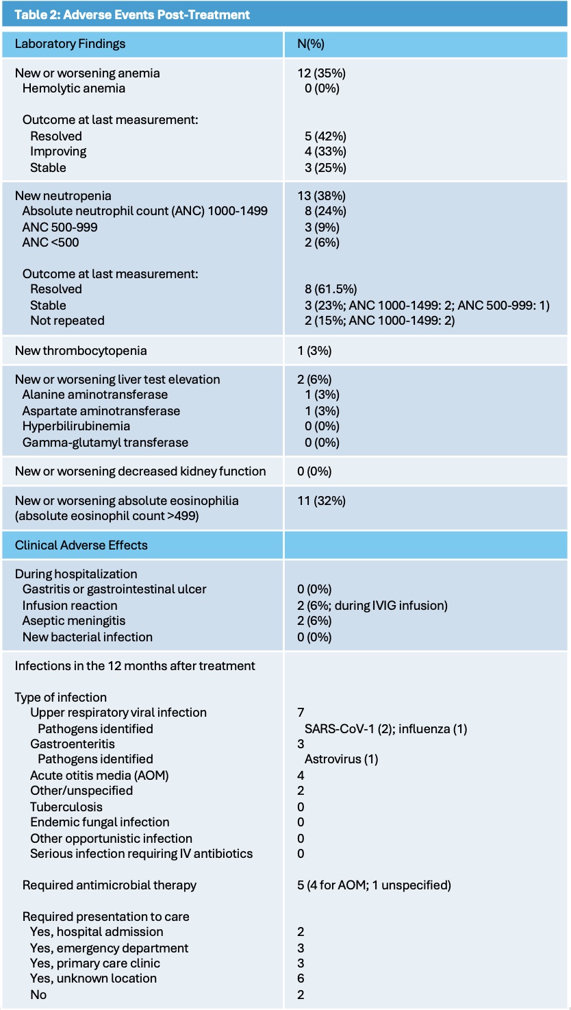 Methods: We conducted a retrospective case series of children with KD (American Heart Association criteria) hospitalized at Children’s Hospital of Colorado between 2017 and 2025 and treated with IVIG and two doses of infliximab (10mg/kg/dose), aspirin, +/- additional therapies. Descriptive statistics were used for cohort analysis. Charts were reviewed through 12-13 months after discharge.