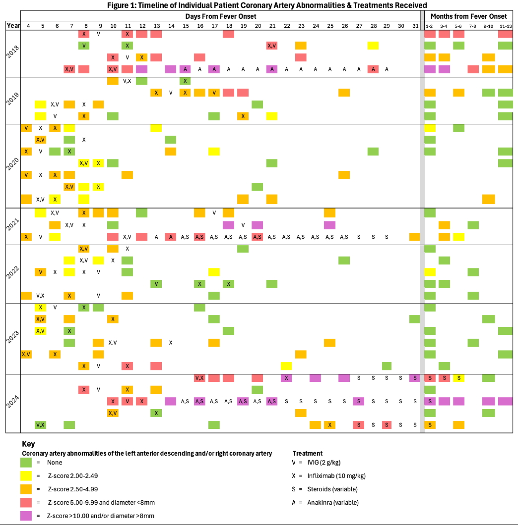 Methods: Each row represents an individual patient. Each shaded square designates that an echocardiogram (echo) was performed on that day of the course of illness from fever onset, with results of the echo color-coded by degree of coronary artery abnormalities as per the key. Treatments received by each patient are represented on this longitudinal timeline by letters as per the key to align with the day that they were received. When more than one therapy was given on a single calendar day, the letters are listed in the order they were administered. Of note, echos and treatments are entered on the calendar day (midnight to midnight) they were obtained; thus, the exact interval between individual echos and therapies cannot be assumed to be a full 24 hours when entered on consecutive days, for example. Summary: 31 of 34 patients received initial intensified therapy with both IVIG (V) and infliximab (X) within a 24 hours of starting either therapy; the remaining 3 patients received IVIG alone. The interval between first and second-dose infliximab ranged from 1-19.6 days, median 2.4 (IQR 1,9, 3.0). Four patients received second-dose IVIG before or concurrently with second-dose infliximab. After 2nd-dose infliximab, 9 patients required additional treatments: anakinra(1), steroids (2), steroids + anakinra (2), and 2nd-dose IVIG (4). Pretreatment echo showed 4 (12%) patients had normal left anterior descending and right coronary artery Z-scores; 7 (20.5%), 17 (50%), and 6 (17.5%) had Z-scores between 2.00-2.49, 2.50-4.99, and 5.00-9.99, respectively. None had giant aneurysms at baseline; 4 later did with 1 with persistence at last follow up. One patient never developed coronary artery abnormalities (CAA). Last available follow up echo (n=11, 9, and 14 at 11-13 months, 7-10 months, and < 7 months, respectively) showed Z-scores of < 2 (normal) in 26 (76%), 2-2.49 in 1 (3%), 2.5-4.99 in 5 (15%), 5-9.99 in 1 (3%), and 10 in 1 (3%).