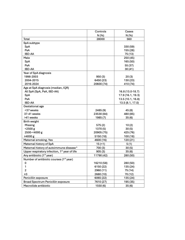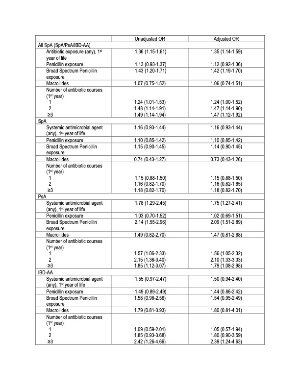We conducted a matched case-control study using data from the Danish National Patient Registry (NPR), the Danish Medical Birth Registry (MBR), the Danish National Prescription Registry, and the Danish Civil Registration System spanning 1998–2024. Cases included individuals diagnosed with SpA, psoriatic arthritis (PsA), or inflammatory bowel disease-associated arthritis (IBD-AA) before age 21. Controls were matched 1:50 on birth year, sex, and calendar year of SpA diagnosis date. The primary outcome was a diagnosis of SpA (including PsA, SpA, and IBD-AA) diagnosed at ≤21 years. The primary exposure was antibiotic use during the first year of life. Secondary exposures of interest included: class of antimicrobial (penicillin, broad-spectrum penicillin, macrolides), number of antimicrobial courses, mode of delivery (cesarean or vaginal), upper respiratory tract infection (any), systemic nonbacterial antimicrobial agent (any). Odds ratios (OR) were computed using conditional logistic regression, with analyses stratified by SpA subtype (SpA, PsA, and IBD-AA ).