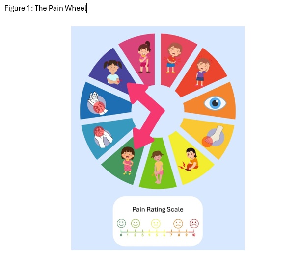 Methods: The Pain Wheel was developed collaboratively by a parent-patient-dyad (JSM and ASM) in June 2025, prioritizing visual engagement, self-expression, and autonomy (Figure 1). The goal was to create a tool that a child could use independently to describe pain experiences across anatomical sites meaningfully to healthcare providers.