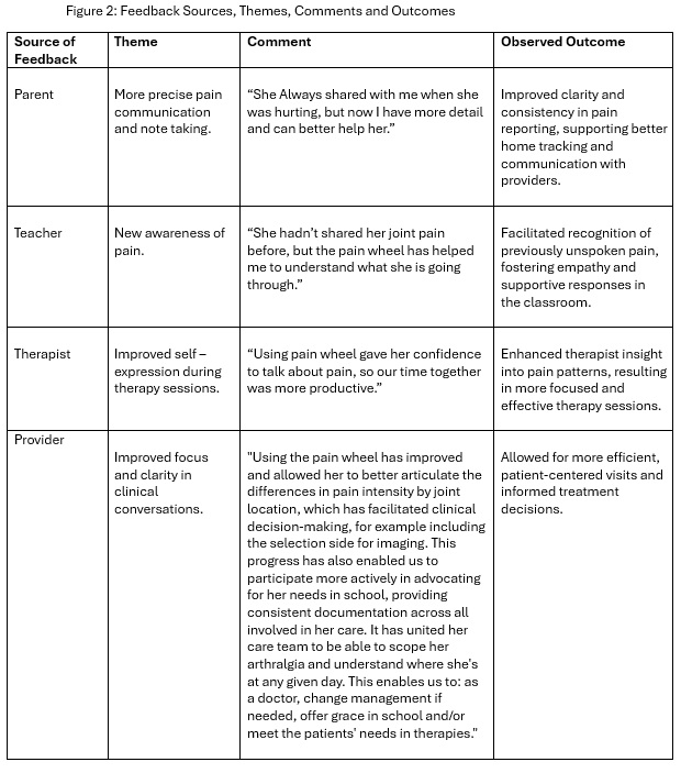 Results: Over 5 months, ASM demonstrated subjectively improved ability to communicate pain location and intensity. Caregivers noted increased independence and minimal prompting (Figure 2: Table ). She effectively shared symptoms with teachers. Providers found pain reports clearer and more actionable, enabling focused discussions and guiding treatment decisions. The circular design and arrow-based interaction facilitated precise identification of pain locations, while the numeric scale supported intensity reporting. Overall, the tool enhanced collaboration and reduced frustration during interactions about her pain.
