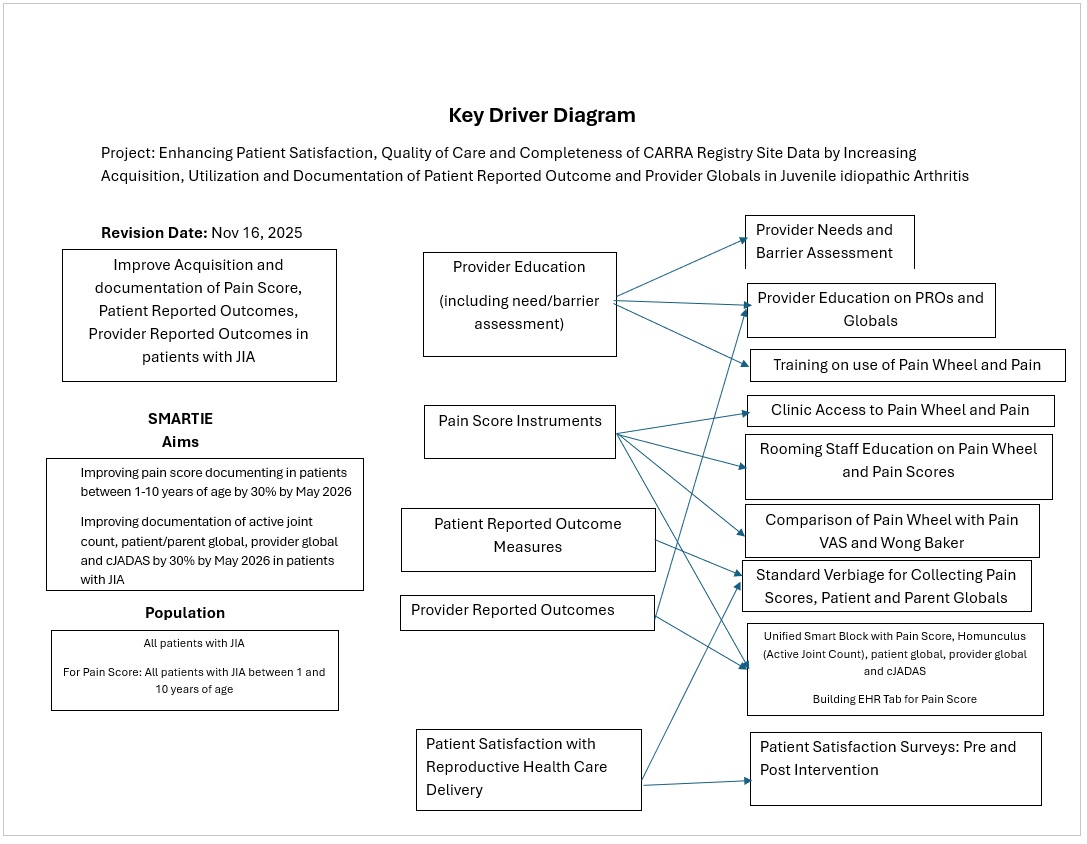 Figure 3: The Key Driver Diagram Supporting image 3Enhancing Patient Satisfaction, Quality of Care and Completeness of CARRA Registry Site Data by Increasing Acquisition, Utilization and Documentation of Patient Reported Outcome and Provider Globals in Juvenile idiopathic Arthritis