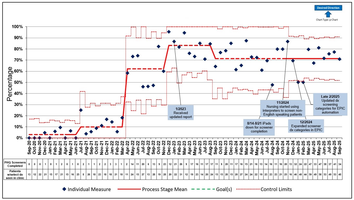 The number of PHQ-8 screeners assigned and completed in clinic by month.