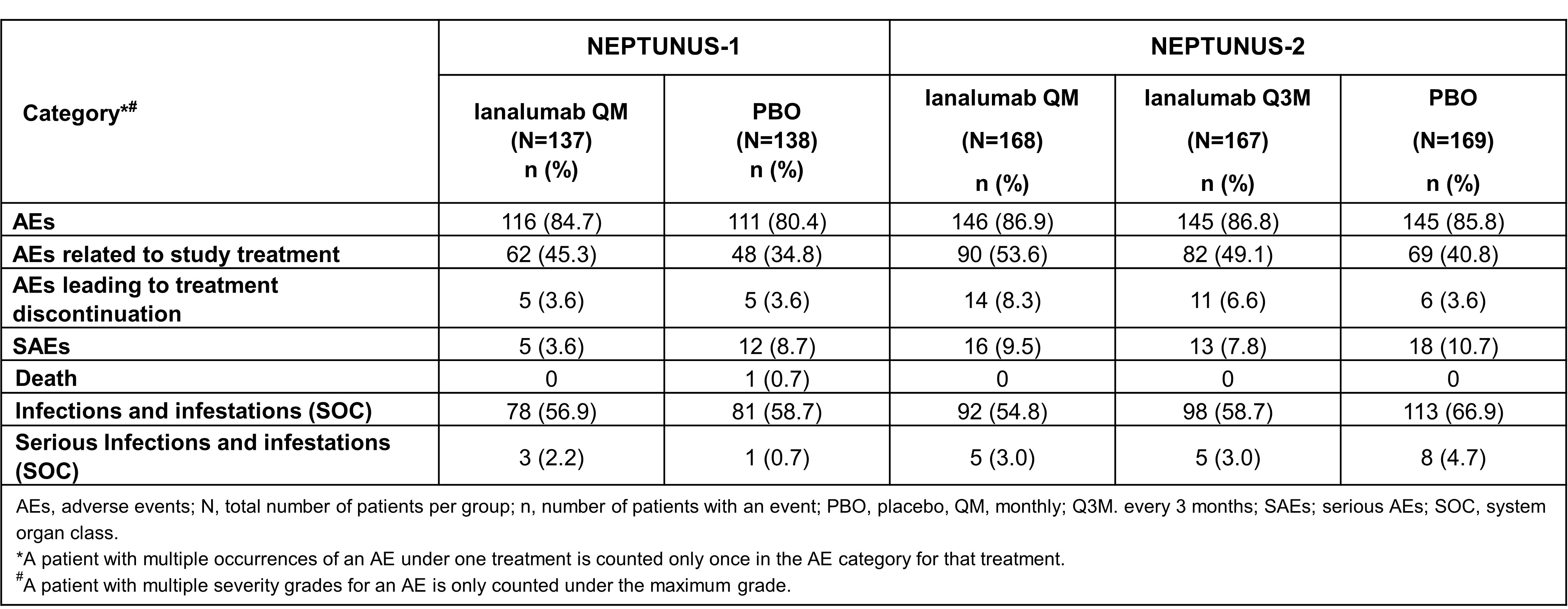 Results: In NEPTUNUS-1, 275 patients and in NEPTUNUS-2, 504 patients were randomized. In both studies, baseline characteristics were generally balanced across treatment arms. Both studies met their primary objective. Ianalumab QM demonstrated statistically significant improvement in ESSDAI CFB at Wk 48 compared to PBO (Fig 1). Patient’s Global Assessment (PaGA; LS mean difference [∆]: -6.6; 95% CI: -11.4, -1.8, p=0.007) and Physician’s Global Assessment (PhGA; ∆: -5.5; 95% CI: -10.1, -0.9, p=0.018) reached nominal statistical significance in NEPTUNUS-1. Additional secondary endpoints showed a trend towards improvement in both studies. Ianalumab showed favorable safety with an overall incidence of adverse events and serious adverse events comparable to placebo in both studies (Table 1).
