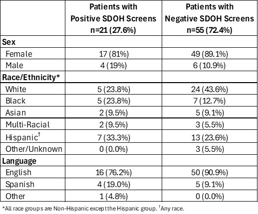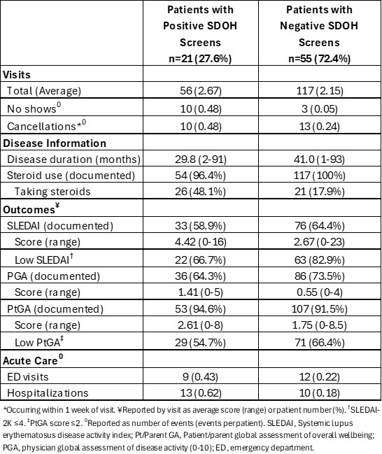 Results: We evaluated data from 76 patients. Twenty-one patients (27.6%) had a pSDOH (Table 1). A higher percentage of patients with a pSDOH identified as Black (23.8% vs 12.7%) or Hispanic (33.3% vs 23.6%) compared to patients with a negative SDOH screen. A non-English primary language was also higher in the pSDOH group (23.8% vs 9.1%). Additionally, the pSDOH group had higher no show and last-minute cancellation rates (Table 2). The average disease duration was less for the pSDOH subset (29.8 vs 41 months), but the range was similar. The pSDOH group had higher steroid use (48.1% vs 17.9%), greater SLEDAI scores (4.42 vs 2.67), and less visits with a low SLEDAI score (66.7% vs 82.9%). Average PGA and PtGA scores were also higher in the pSDOH group (1.41 vs 0.55 and 2.61 vs 1.75, respectively). Lastly, ED visits and hospitalizations per patient were higher in our pSDOH cohort.