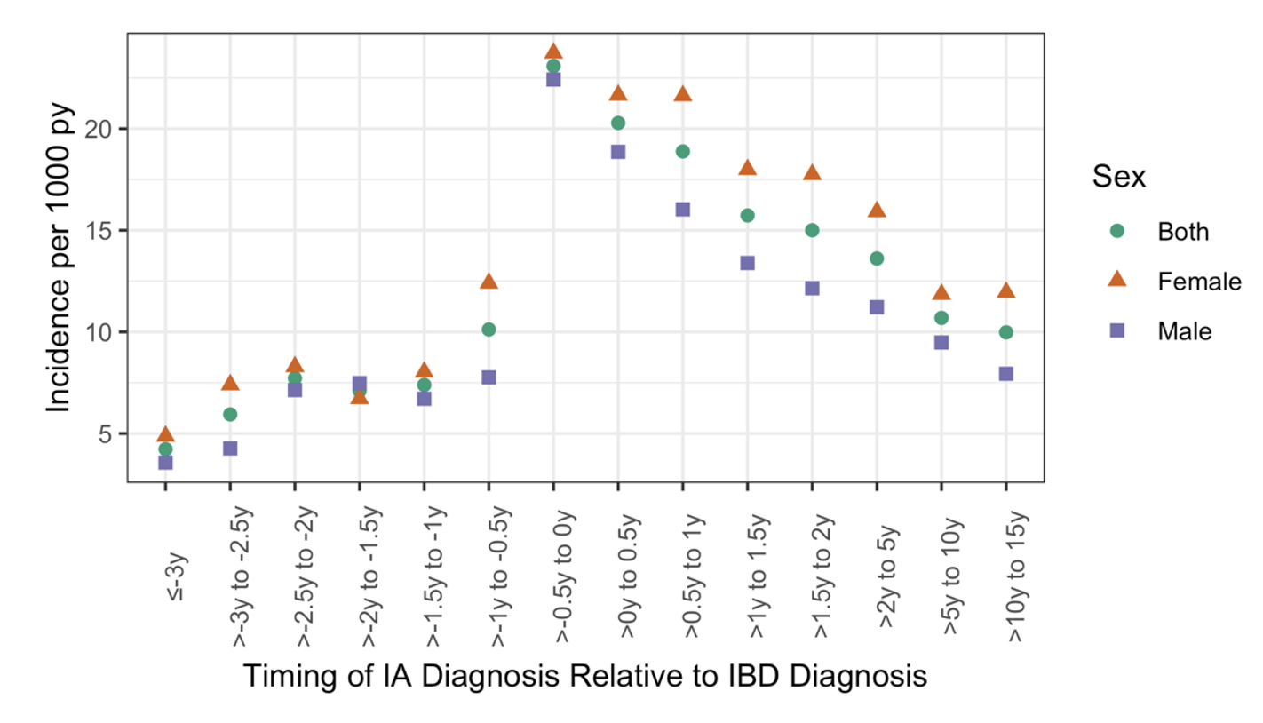 Figure. Incidence of IA among incident IBD cases, stratified by sex