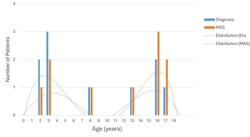 Results: Of 123 patients with juvenile IIMs followed at our center 16 patients were screened with ICD-10 codes and on further detailed review, 10 patients were included in this series as having MAS diagnosed by a pediatric rheumatologist, 5 of whom required admission to the intensive care unit. Eight of the ten patients were diagnosed with MAS at or near IIM diagnosis, whereas two patients were diagnosed 13 and 15 years after IIM onset. Age of IIM onset ranged from 2-17 years old, and range of MAS onset was also 2-17 years old, with a bimodal distribution (Figure 1).  Median creatinine kinase was 2498 IU/L (range 57-30176 IU/L), median ferritin was 2655 ng/mL (range 429-9720 ng/mL), and median platelets were 142 k/mm3 (range 8-461 k/mm3). Twenty percent of patients met hemophagocytic lymphohistiocytosis (HLH) 2004 criteria, whereas eighty percent of patients met the 2016 sJIA-MAS criteria. There were a variety of myositis specific antibodies including three patients with anti-MJ (NXP2), two of whom were admitted to the ICU, two with anti-P155/140 (TIF-1- γ), two with anti-MDA5, one patient with anti-JO1, and two without identified myositis autoantibodies (Table 1). Treatment included corticosteroid pulses for all ten patients, anakinra for six of the ten patients, cyclosporine for two patients, cyclophosphamide for one patient, and one did not require additional immune suppressant therapy beyond steroids. Seven patients were started on IVIG as part of their IIM maintenance therapy around the time of their MAS, and another had recently received cyclophosphamide prior to their MAS episode.
