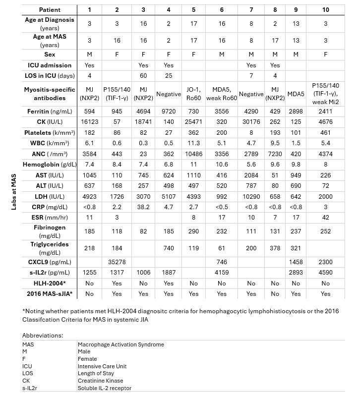 Methods: A retrospective chart review was conducted at a single large quaternary center using ICD-10 codes for juvenile IIM (M33.0, M33.2, G72.4) in the electronic medical record to identify patients with juvenile IIMs and macrophage activation syndrome (D76.1) between 1/1/2009 and 12/1/2024. In our search, our patients’ MAS episodes occurred between 2009 and 2024. Patients with normal ferritin (< 100ng/mL) or lack of fever on review were excluded. Descriptive statistics and a review of the literature on juvenile IIM and MAS were completed.
