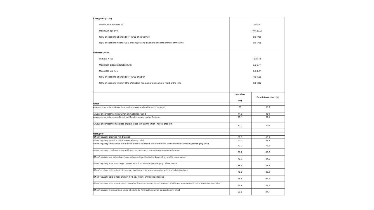 Results: Of 67 dyads screened to date, 22 (33%) were randomized (11 intervention, 11 control). Most caregivers were mothers (86%), mean age 40.6 ± 6.5 years. Children were predominantly female (82%) with a mean age at enrolment of 9.3 ± 2.7 years and disease duration of 5.3 ± 3.1 years. Attendance was higher among caregivers than children (≥80% session attendance: 75% vs. 50%), with strong engagement in both groups (camera on ≥85% of session: 75% vs. 88%).