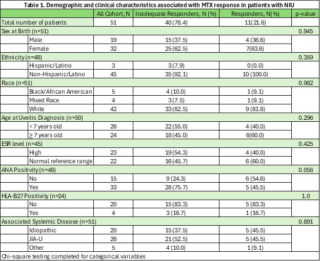 Methods: This is a retrospective, single center, chart review study of patients diagnosed with NIU, seen between 2002-2022 and were treated with MTX. Ophthalmic risk factors of interest included, 1) uveitis laterality and location, 2) best-corrected visual acuity (BCVA) in the worse-seeing eye at diagnosis, 3) anterior cell grade at diagnosis and 6 weeks after therapy, 4) oral/topical steroid requirement in the first 6 weeks of diagnosis, and 5) total number of ocular complications. NIU patients were classified as responders to MTX monotherapy if 1) anterior chamber (AC) cell grade was classified as 0 in affected eye(s) and described as “quiet”, “quiescent”, “no active inflammation”, 2) absence of vitreous haze or other indications of uveitis activity by dilated exam/imaging, 3) ≤2 drops of prednisolone acetate 1% or equivalent/day, and 4) no oral corticosteroid. Clinical phenotypes and laboratory characteristics were compared between MTX inadequate responders (MTX-IR) and MTX responders (MTX-R) using Chi-square and two sample tests.
