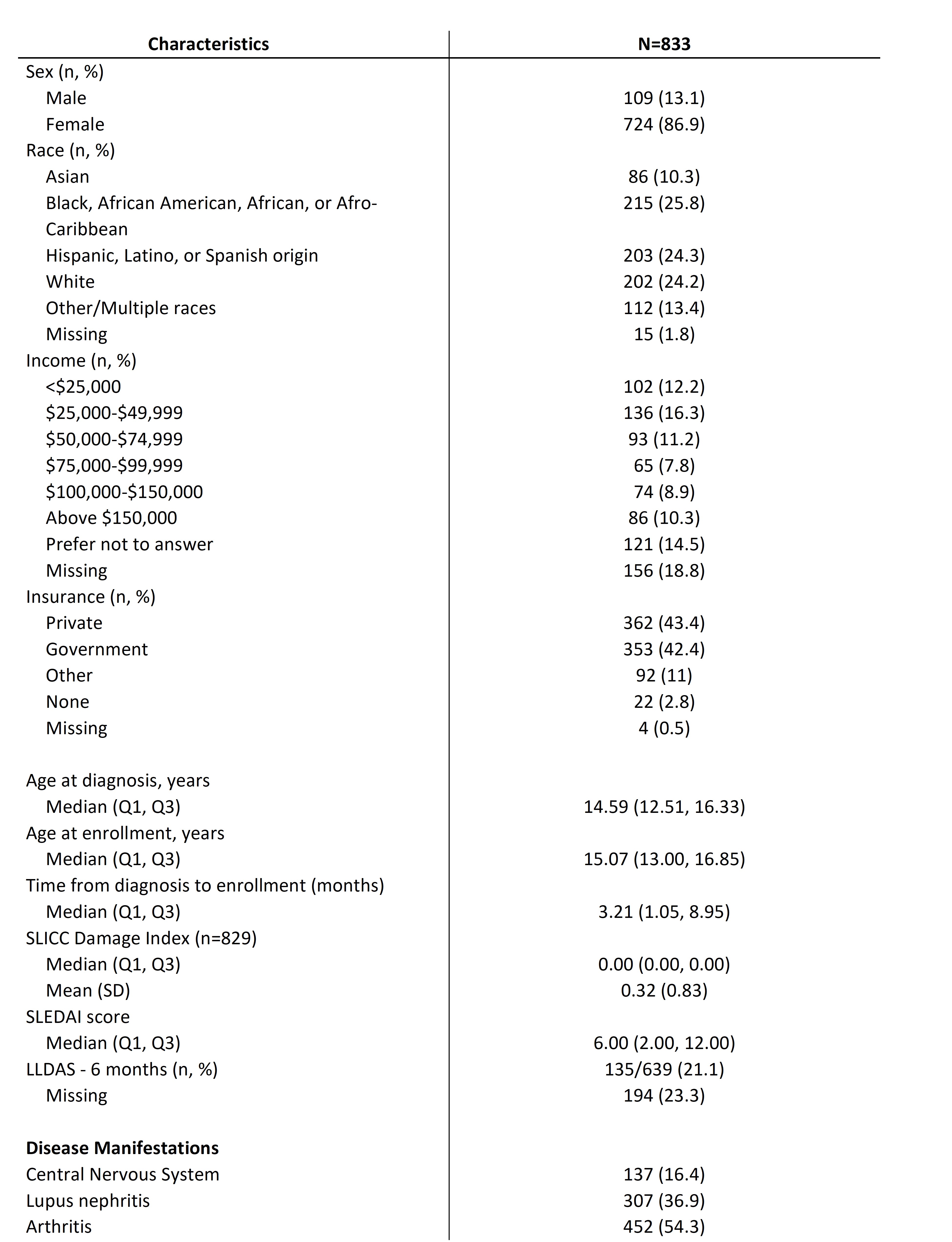 Table 1: Baseline characteristics of childhood-onset systemic lupus erythematosus participants in the CARRA registry
