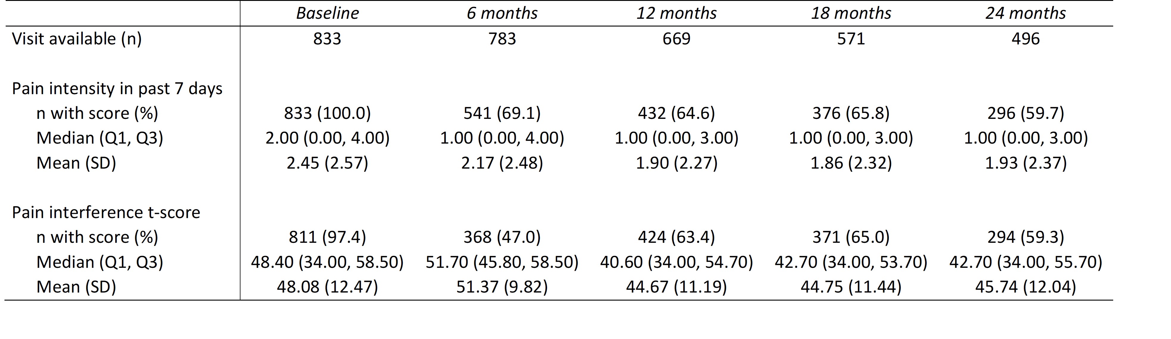 Results: 833 participants were included this analysis. Baseline sociodemographic and disease characteristics are summarized in Table 1. Participants had a median age of enrollment of 15 years (13.00, 16.85), median time from diagnosis to enrollment of 3.21 (1.05, 8.95) months and median SLEDAI at enrollment of 6.00 (2.00, 12.00). Pain measures at baseline and at every 6 month visits are shown in Table 2. Median pain intensity score was 2 (0, 4) at baseline and 1 (0, 3) at the 24 month follow-up. Pain interference scores suggest that at baseline and 6 months, participants experience similar pain interference as the average person in the general population 48.40 (34.00, 58.50); pain interference scores decreased to 42.70 (34.00, 55.70) at 24 months. There was no significant difference in baseline pain scores between by sex. At the baseline visit there was a significant difference in pain intensity (2 (0,5) vs 1 (0,4), p= 0.0030) and pain interference (50.6 (34.0,59.5) vs 45.8 (34.0,56.0), p=0.0069) for participants with and without arthritis, respectively.
