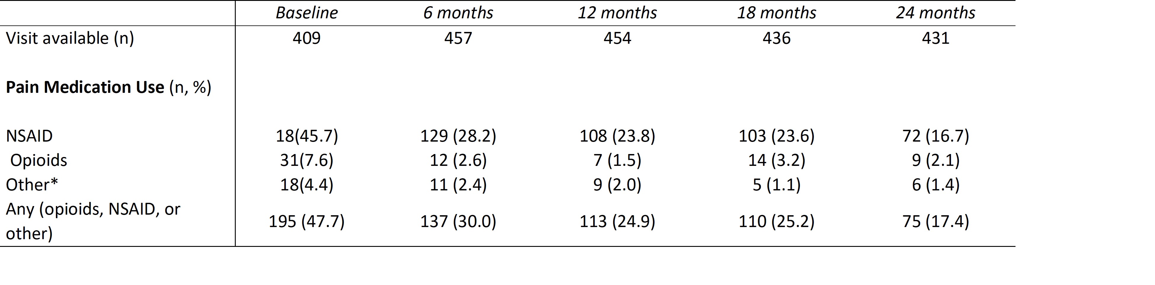 Pain medication data was available for 409/833 (49.1%) of participants at baseline. As summarized in Table 3, non-steroidal anti-inflammatory medications were the most commonly prescribed medications for cSLE related pain. 7.6% of participants received opioids prior to or at the baseline visit with a decrease in the frequency of opioid, and other pain medication prescription, at subsequent follow-up visits.