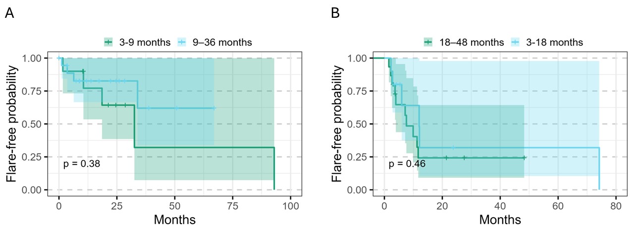 Results: Within CHOIR, 35 patients achieved clinical disease remission following NSAID monotherapy prior to medication discontinuation (n=10 for 3-9 months [short duration], n=17 for 9-24 months [long duration], 8 excluded for duration < 3 or >24 months). Baseline characteristics were similar between the short and long duration groups (Table 1). During the 2- year follow-up, approximately 70% of patients in the short-duration group and 40% in the long-duration group experienced a disease flare, though this was not statistically significant (p = 0.38, Figure 1A). In the TNFi cohort, 26 patients achieved clinical remission and stopped TNFi within 48 months (n=10 for 3-18 months [short duration] versus n=16 for 18-48 months [long duration]). Distribution of spinal lesions, sacroiliitis, psoriasis, concurrent use of csDMARD, or bisphosphonate were similar between the groups (Table 2). There was no significant difference in disease flares between the short and long-duration groups, with approximately 40% of patients maintaining disease remission during the average 2-year off-medication observation periods (p=0.46, Figure 1B).
