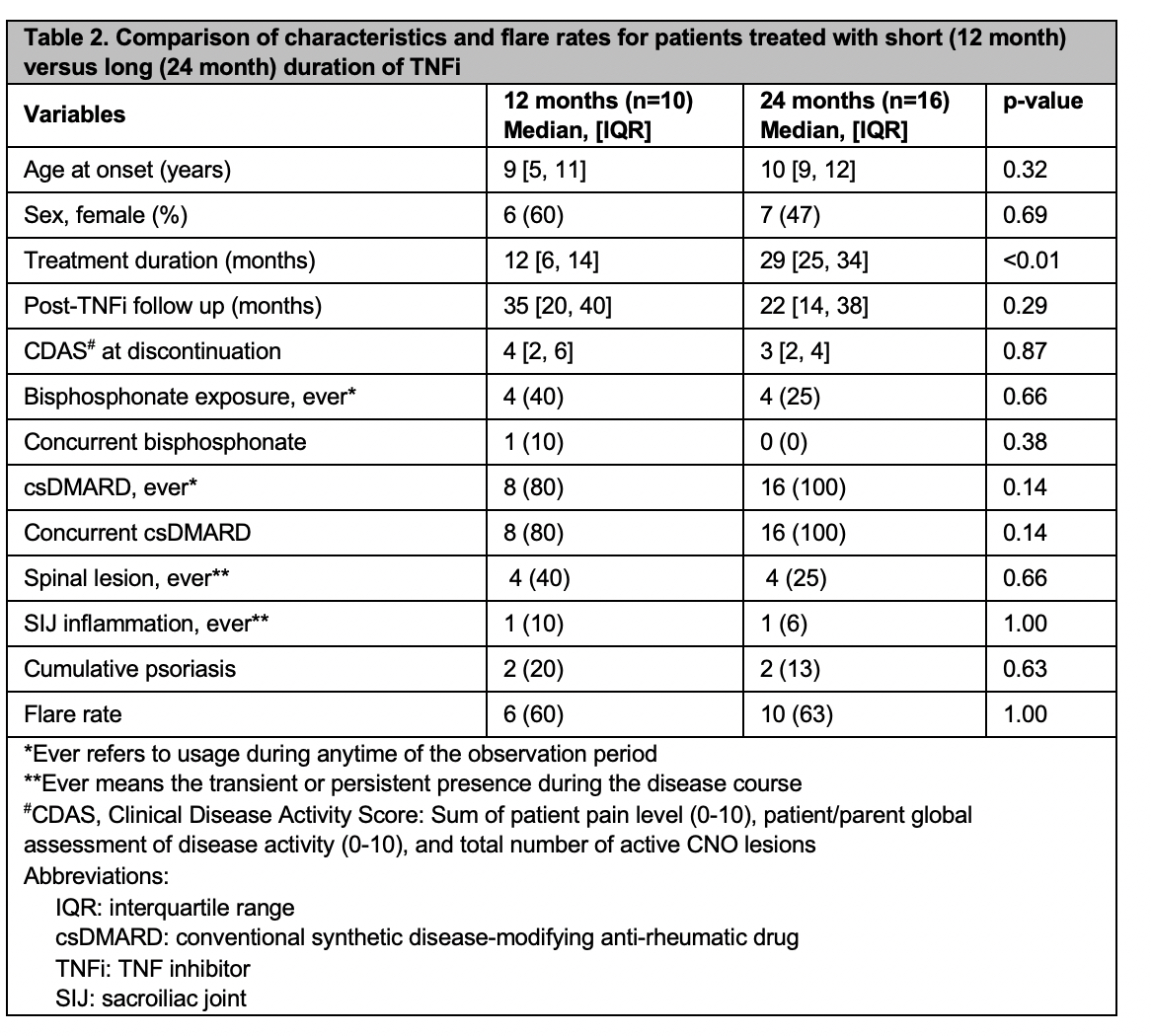 Table 2. Comparison of characteristics and flare rates for patients treated with short (12 month) versus long (24 month) duration of TNFi