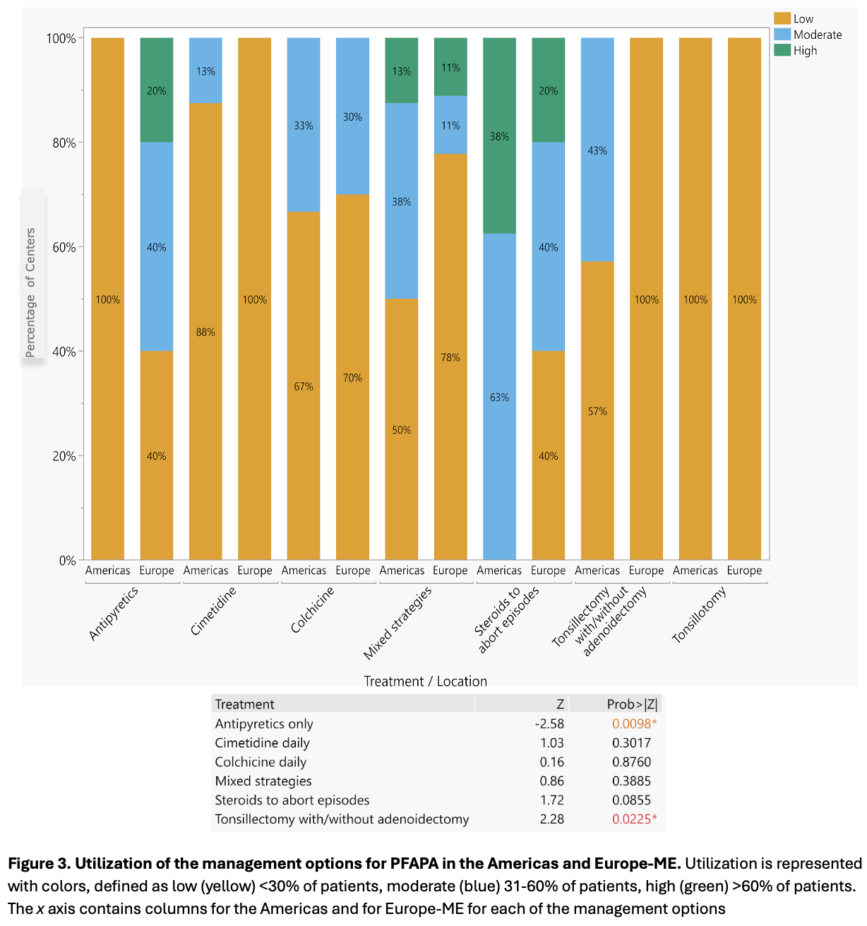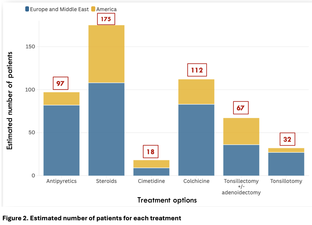 Conclusion: Our survey demonstrated adequate patient availability for most of the treatment options. Steroids and colchicine are the most used strategies, while cimetidine and tonsillotomy are less used across the board. There is a systematic difference in the proportion of treatment usage for antipyretics and for tonsillectomy with or without adenoidectomy, with these options being more frequently used in Europe and in the Americas, respectively. No significant differences were found in the other treatment preferences. These findings support the feasibility of conducting comparative effectiveness studies and highlight the importance of international collaboration.