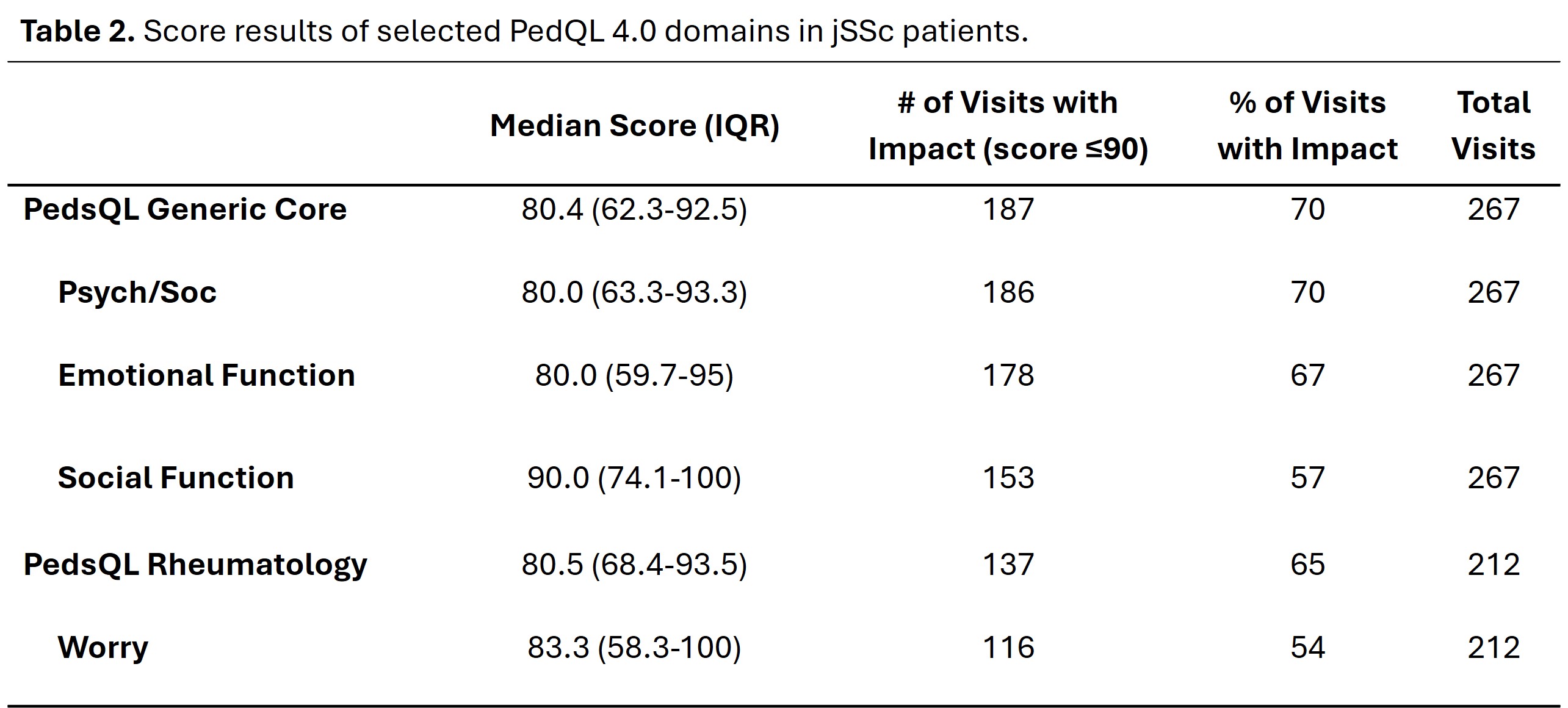 Results: A total of 89 patients with jSSc ranging in age from 6-24 were included, with demographic information reported in Table 1. Each patient completed the PedQL 4.0 Generic Core questionnaires across 267 visits, and 212 visits with the Rheumatology modules. There was a median of two visits per patient. Across all domains analyzed, the majority of visits yielded suboptimal scores (less than 90) (Table 2). Over two-thirds of visits demonstrated impaired outcomes in emotional functioning (e.g., sadness, anger, worry, sleep disturbance) and psychological/social domains (e.g., difficulty keeping up with peers, feeling sad or blue) (Table 2).
