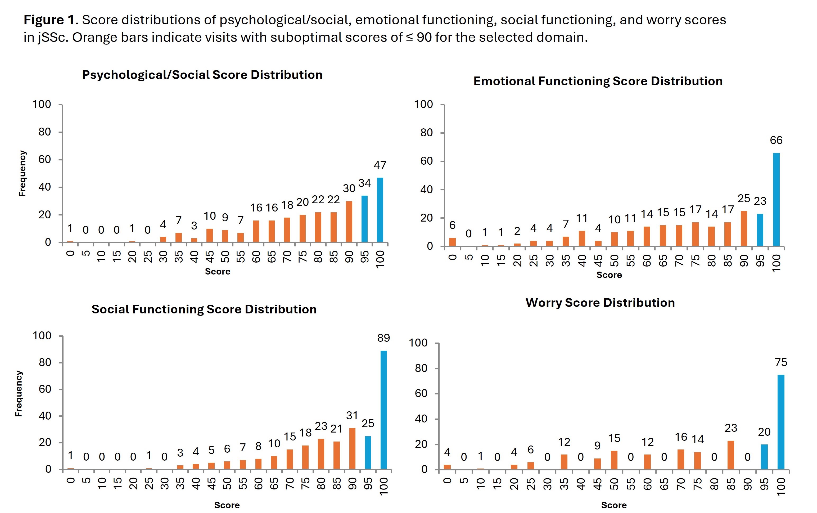 Figure 1. Score distributions of psychological/social, emotional functioning, and worry scores in jSSc. Orange bars indicate visits with suboptimal scores of less than or equal to 90 for the selected domain.
