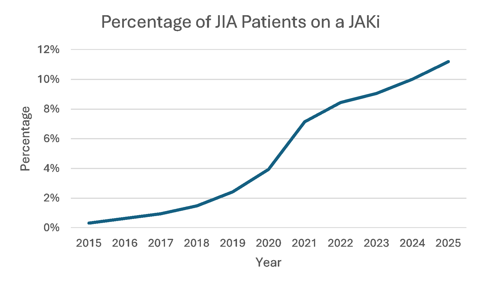 Results: We identified 44,928 pediatric patients diagnosed with JIA during the 10-year study period (Table 1). The percentage of patients on a JAKi increased significantly during the study period from 0.3% to 11% (Figure). There were 46 thrombotic events in patients treated with a JAKi (Table 2). The corresponding risk ratio and 95% confidence interval were 1.399 [1.03,1.90].