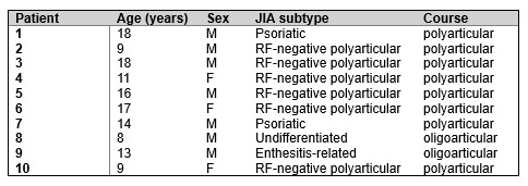 Demographics of participating patients. Patient ages ranged from 8 years-old to 18 years-old. Using the ILAR criteria, juvenile idiopathic arthritis (JIA) subtypes included psoriatic, RF-negative polyarticular, enthesitis-related, and undifferentiated