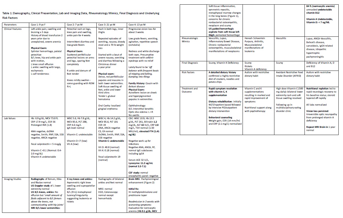 Conclusion: These cases highlight the need to recognize severe nutritional deficiencies as mimics of rheumatic diseases. The first case demonstrates how vitamin C deficiency could resemble lupus, vasculitis, Inflammatory bowel disease and chronic nonbacterial osteomyelitis. The second case is a rare combination of scurvy and rickets raising concerns for leukocytoclastic vasculitis, arthritis and even musculoskeletal manifestations of acute leukemia. The third patient is a young adult who underwent extensive and invasive work-up before being treated for avoidant restrictive food intake disorder (AFRID)-a diagnosis that was unmasked by its complication of scurvy mimicking a vasculitic rash. Lastly, in the fourth case, pachymeningitis with progressive visual loss raised suspicions for Behcet’s disease, neurosarcoid and IgG4 related disease but was ultimately found to be due to vitamin deficiencies. These cases underscore the importance of a detailed dietary history and full nutritional assessment, especially in at-risk individuals in preventing misdiagnosis, unnecessary immunosuppression, and treatment delay
