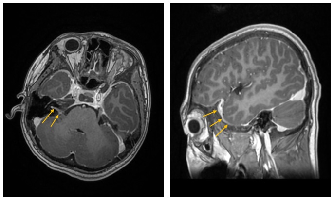 Case 4: MRI brain showing mild diffuse pachy-meningeal enhancement, pituitary hypo-enhancement (normal functional studies), possible neuritis of the auditory canals and prominence of the optic discs bilaterally