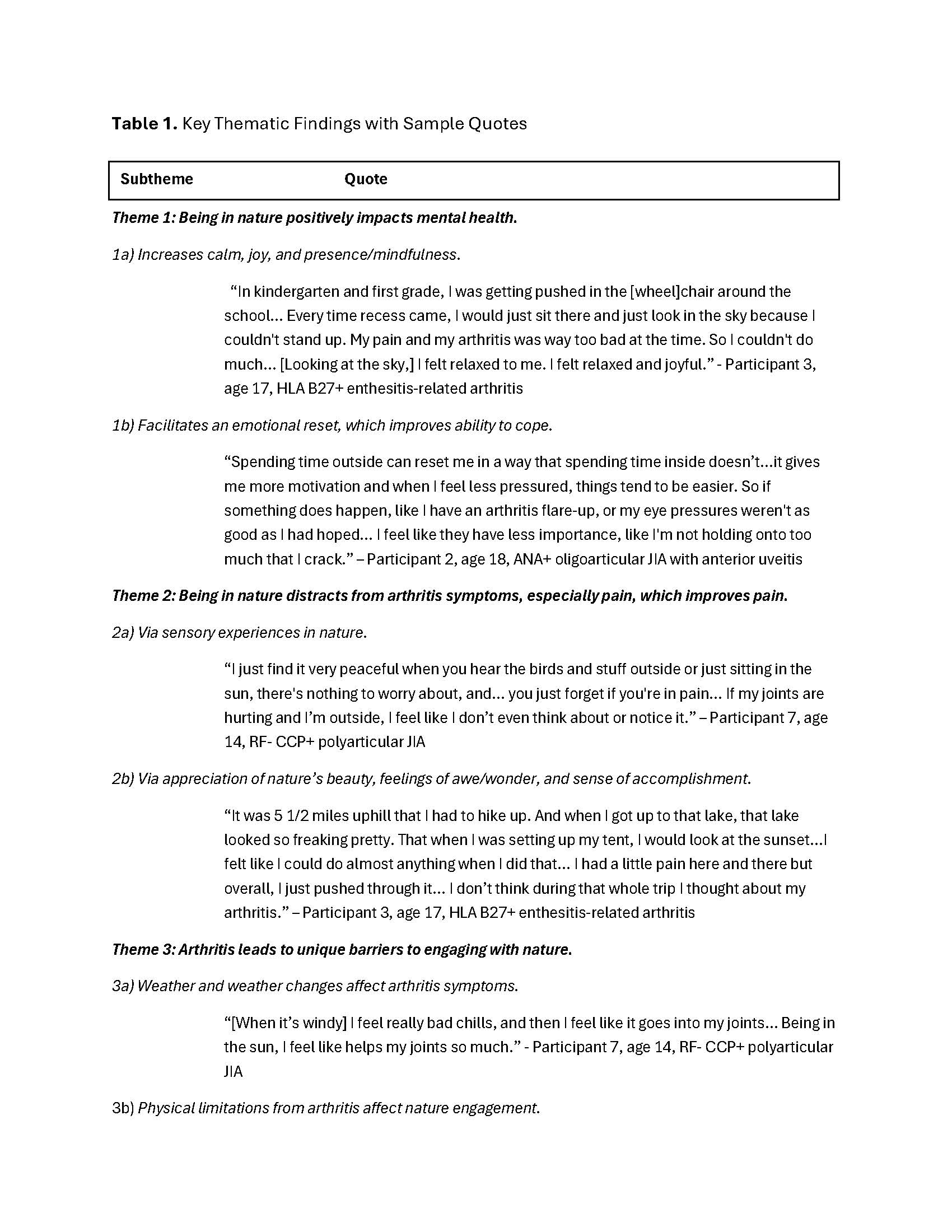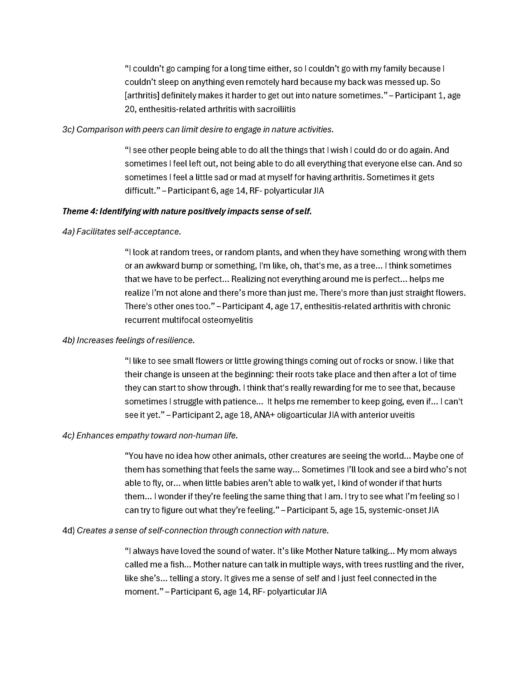 Conclusion: Adolescents with JIA perceive that nature engagement positively impacts their health through increasing calm and joy while decreasing stress and worry, improving perceived pain, and facilitating connection, empathy, and a positive sense of self. NBIs may be promising, novel approaches to support the holistic health and wellbeing of youth with JIA and other rheumatic diseases. Future research directions include trialing NBIs among adolescents with JIA and exploring nature engagement among youth with other rheumatic diseases.
