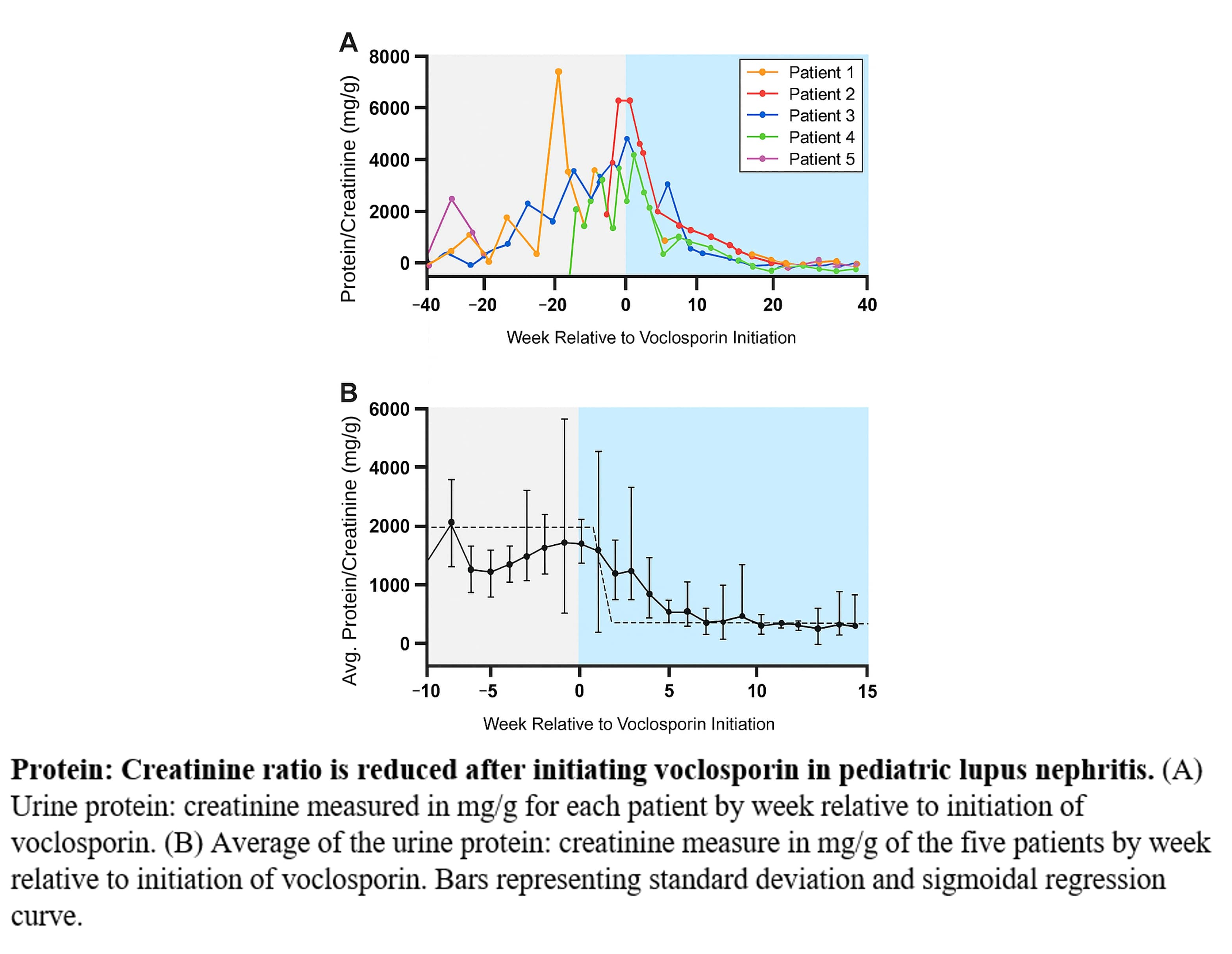 Results: Five pediatric patients (aged 10-15 years at SLE diagnosis) with refractory or relapsed LN were treated with voclosporin (doses of 15.8-23.7 mg twice daily). One patient with Class IV/V LN, after failing multiple agents, achieved significant improvement in proteinuria and sustained renal remission without side effects . Another patient who had persistent proteinuria despite MMF, tacrolimus, and intravenous cyclophosphamide achieved a substantial reduction in proteinuria, which allowed for steroid discontinuation and sustained remission. A third patient with Class V LN who had persistent renal involvement despite MMF, hydroxychloroquine, and belimumab experienced rapid improvement in proteinuria after voclosporin was added. One patient discontinued voclosporin after 14 months of good renal response due to persistent hypertension. Overall, the treatment was associated with a reduction in the mean urine Protein/Creatinine ratio across the cohort.