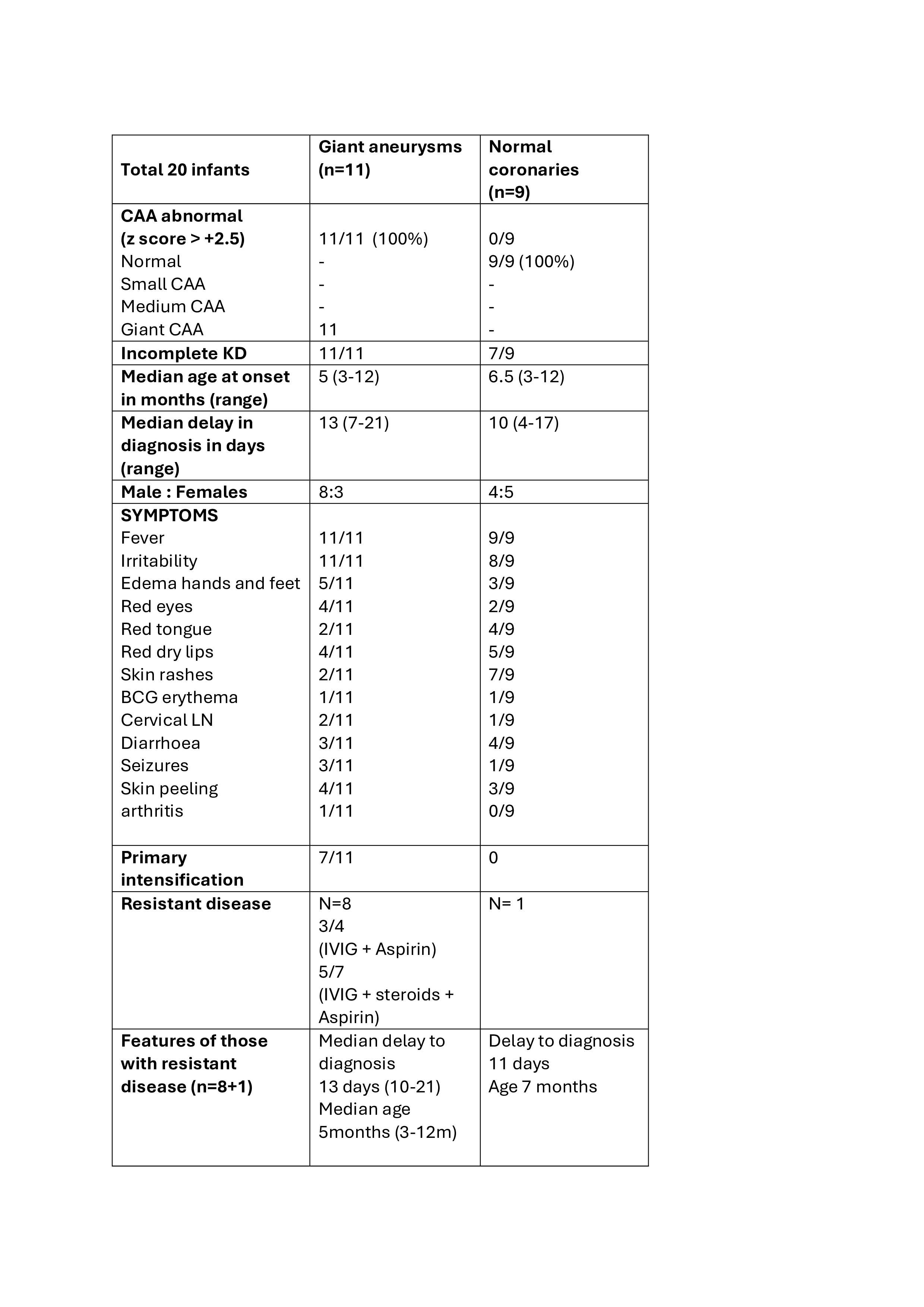 Results: Among 20 infants, 11 had giant CAAs, and 9 had normal coronary arteries. All infants with giant aneurysms had incomplete KD. Median age at onset was slightly lower at 5 months for giant CAA and 6.5 months for normal group (p=0.12); diagnosis delay was longer in giant CAA group (median 13 vs 10 days, p=0.04). Male predominance was noted in the giant CAA group (73% vs 44% in normal, p=0.37). Common symptoms included fever (100% giant vs 89% normal) and irritability (45% vs 33%). Primary intensification was given in 7/11 (63.6%) giant CAA infants versus none in normal group (p=0.003). IVIG resistance was higher among giant CAA infants (Table 1).