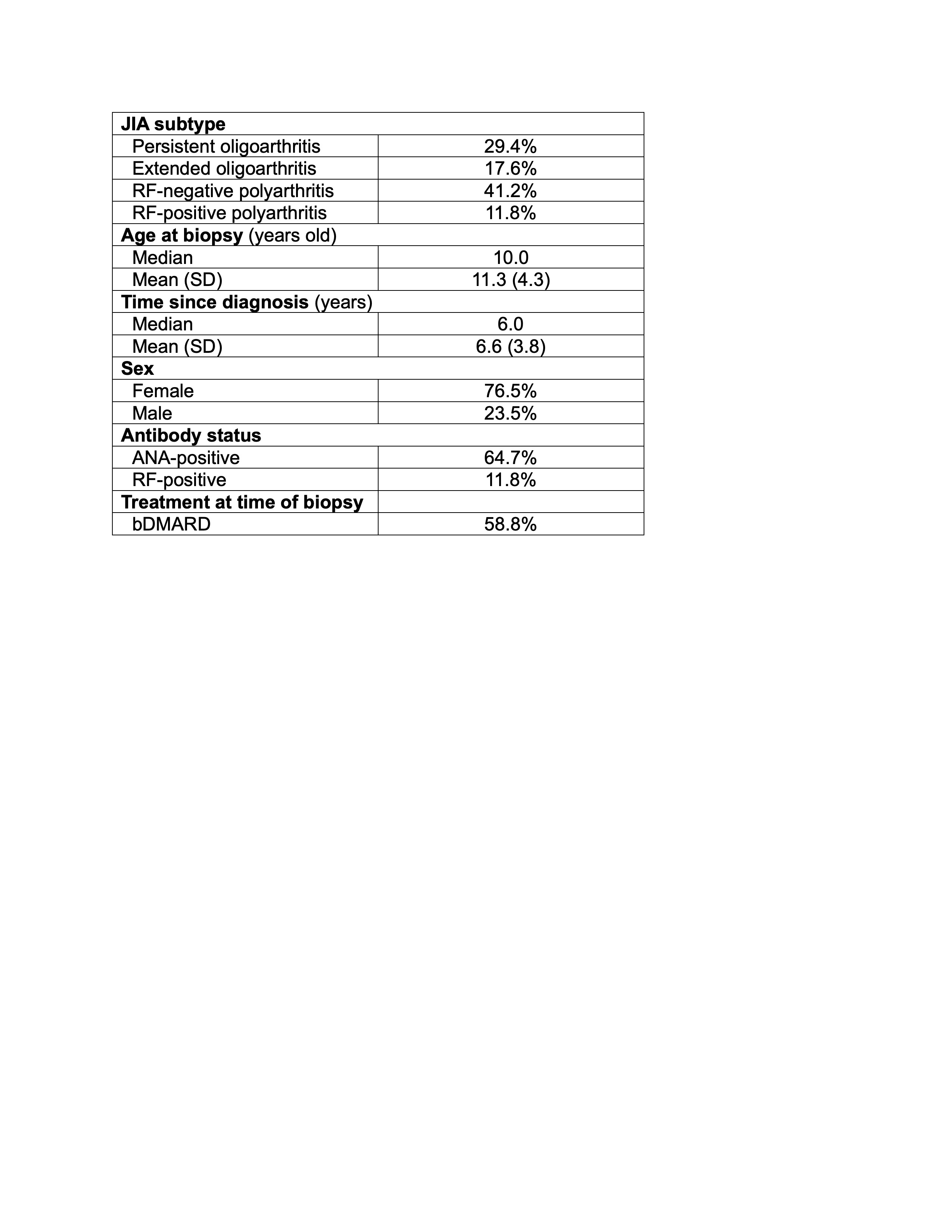 Results: We obtained high quality knee synovial biopsies from 17 patients with oligoarticular or polyarticular JIA (Table 1); all patients tolerated the procedure well. Single-cell RNA sequencing (scRNA-seq) detected a median of 1,054 to 3,632 genes per cell from 10 patients, with data currently under analysis. To date, spatial transcriptomic analysis has been performed on synovial tissue from 4 of these patients. In addition, FFPE synovial tissue samples from 5 additional patients have been prepared for Xenium-based spatial transcriptomics. We identified 11 clusters that comprise diverse immune cell populations—including monocytes, macrophages, T-, B-, plasma, and dendritic cells—organized regionally in relation to the synovial lining and sublining layers. In contrast to samples from patients with rheumatoid arthritis (RA) in which fibroblast-like synoviocytes outnumber macrophages, most synovial cells from JIA samples were macrophages (Figure 1). Future studies will delineate the topography of the individual subpopulations in JIA synovium compared to RA synovium.