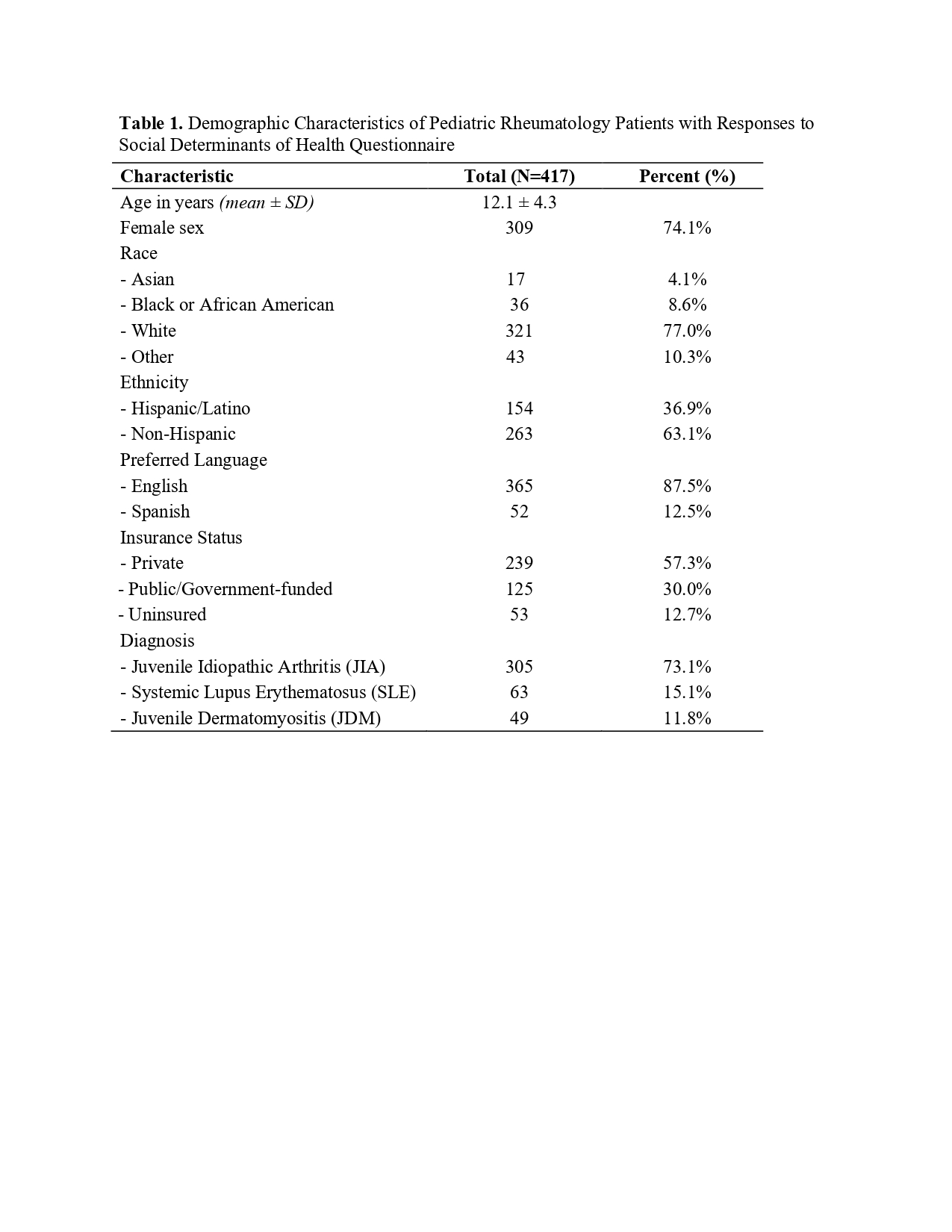 Demographic Characteristics of Pediatric Rheumatology Patients with Responses to Social Determinants of Health QuestionnaireSupporting image 1