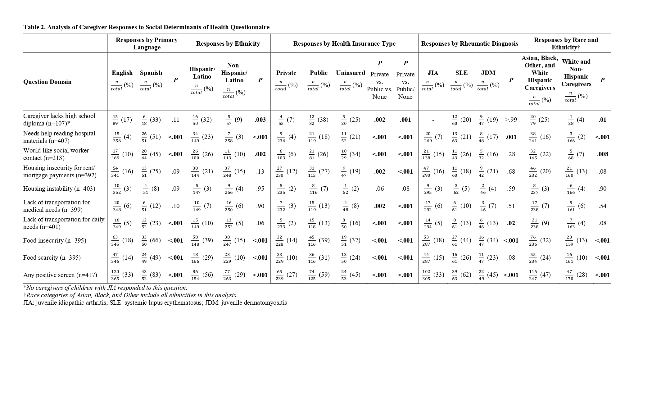 Methods: We conducted a cross-sectional study of caregiver-reported SDoH collected at routine pediatric rheumatology clinic visits from February to May 2023. Of 862 surveys, 562 surveys from unique caregivers met inclusion criteria; duplicates and surveys from ineligible diagnoses were excluded, leaving 417 surveys eligible. Surveys assessed caregiver education, health literacy, food security, housing stability, transportation, and social work support. Neighborhood deprivation was measured using the Area Deprivation Index (ADI). Associations between SDoH and sociodemographic and economic factors were examined using univariate and post-hoc tests with complete case analysis.