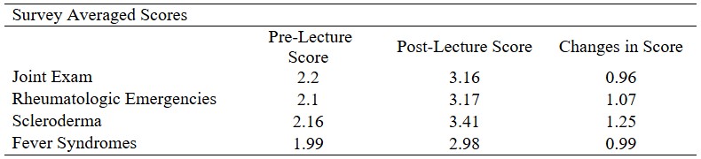 Conclusion: Hands-on and case-based teaching improves resident confidence in recognizing pediatric rheumatologic conditions. By utilizing these tools to provide insight into common topics and emergencies within this field, residents have shown increased confidence in identifying these conditions. This evaluation of residents’ confidence in identifying pediatric rheumatology conditions shows potential for future multimodal lectures that better target weaknesses in rheumatology education.1. Shalen J, Austenfeld E, Vater M, Curran M, Hayward K, Mehta J, et al. Essential Areas of Knowledge in Rheumatology for Pediatric Residents: A Modified Delphi Study. Pediatrics. 2025;156(1).